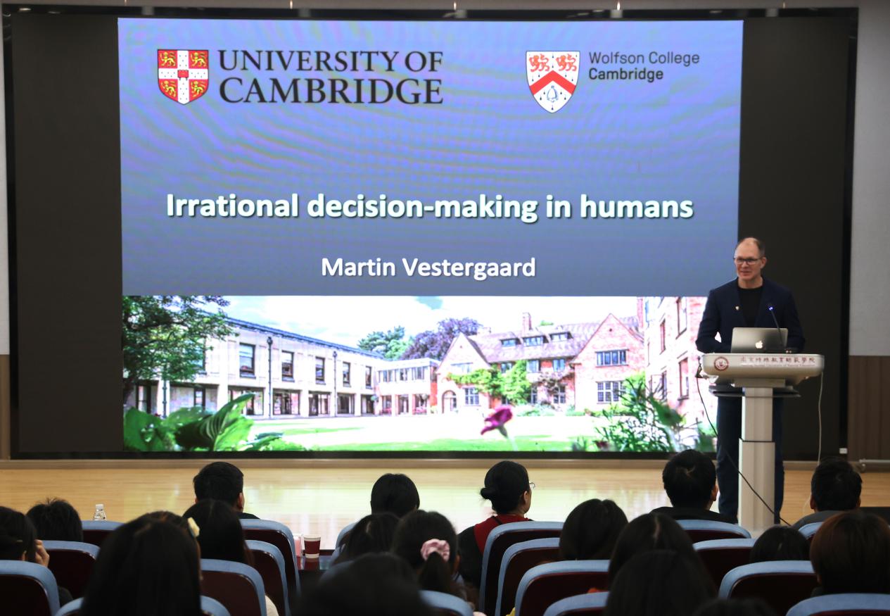 Martin Vestergaard教授为现场师生带来题为《Irrational decision making in humans》的学术讲座,讲述他通过心理学实验、脑成像技术等厘清人类非理性决策过程中的相关指标和行为表现。Martin教授的讲座生动有趣,结合日常生活案例分析决策过程中的错误与偏见、理性决策与非理性决策的生理差异,激发现场与会者的热烈讨论。Martin Vestergaard教授热情解答了师生的提问,并期待双方能够继续在专业建设和人才培养等方面开展合作。