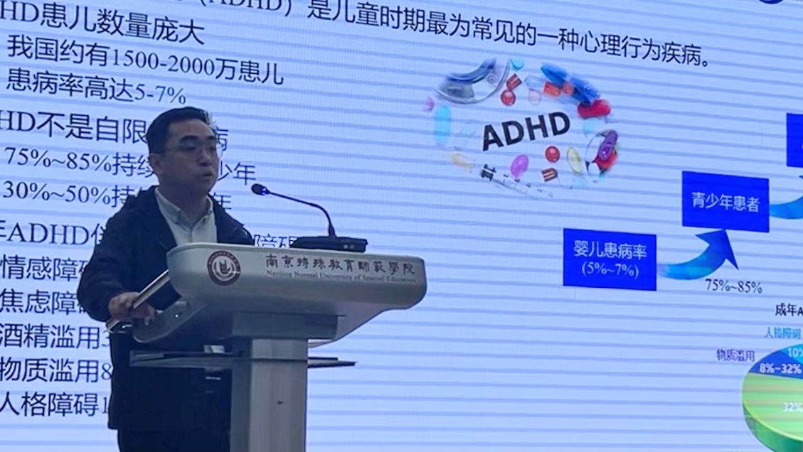 蒋博士首先向师生简要介绍了中国科学院计算技术研究所的发展历程与尖端技能,随后从国家政策背景切入,借助一系列统计数据说明对注意力缺陷多动症儿童进行早期评估与诊断的重要意义。蒋博士充分分析了ADHD临床现有诊断与评估手段面临的问题,基于国际通用量表DSM-5和检测范式,向与会师生介绍了研究所设计并实现的基于可穿戴行为感知的儿童ADHD智能量化评估系统,并展示了现有面向儿童ADHD康复的游戏设计及注意力干预训练系统。