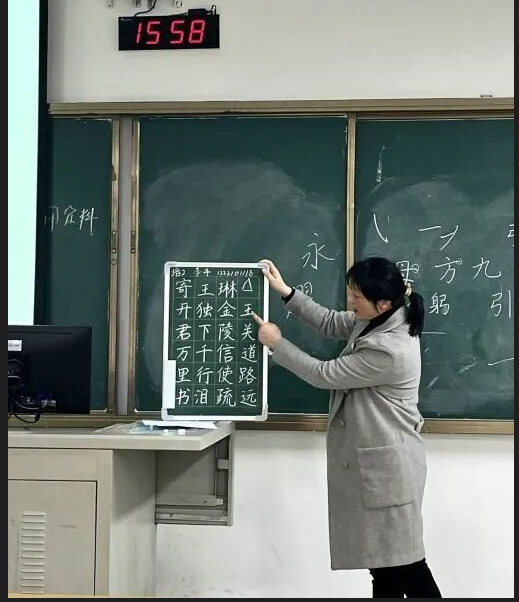 在热烈的研讨互动环节中,刘老师邀请了几位同学上台在黑板上书“梅”、“遥”、“勇”、“延”等字,并逐一进行了细致的点评和书写指导。此外,她还对走廊上展出的黑板字作品进行了错误指正和示范书写,随后展示了优秀的粉笔字和硬笔字书法作品,同学们纷纷表示受益匪浅。
