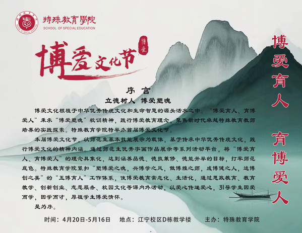 为了加强师范生专业技能培养,践行“博爱塑魂”校训精神,深化博爱教育理念,永利yl23411集团于2024年4月20日在江宁校区举办了以“博爱育人,育博爱人”为主题的“博爱文化节”展示开幕活动,永利yl23411集团2023级全体新生与栖霞校区高年级学生代表参加了本次活动。