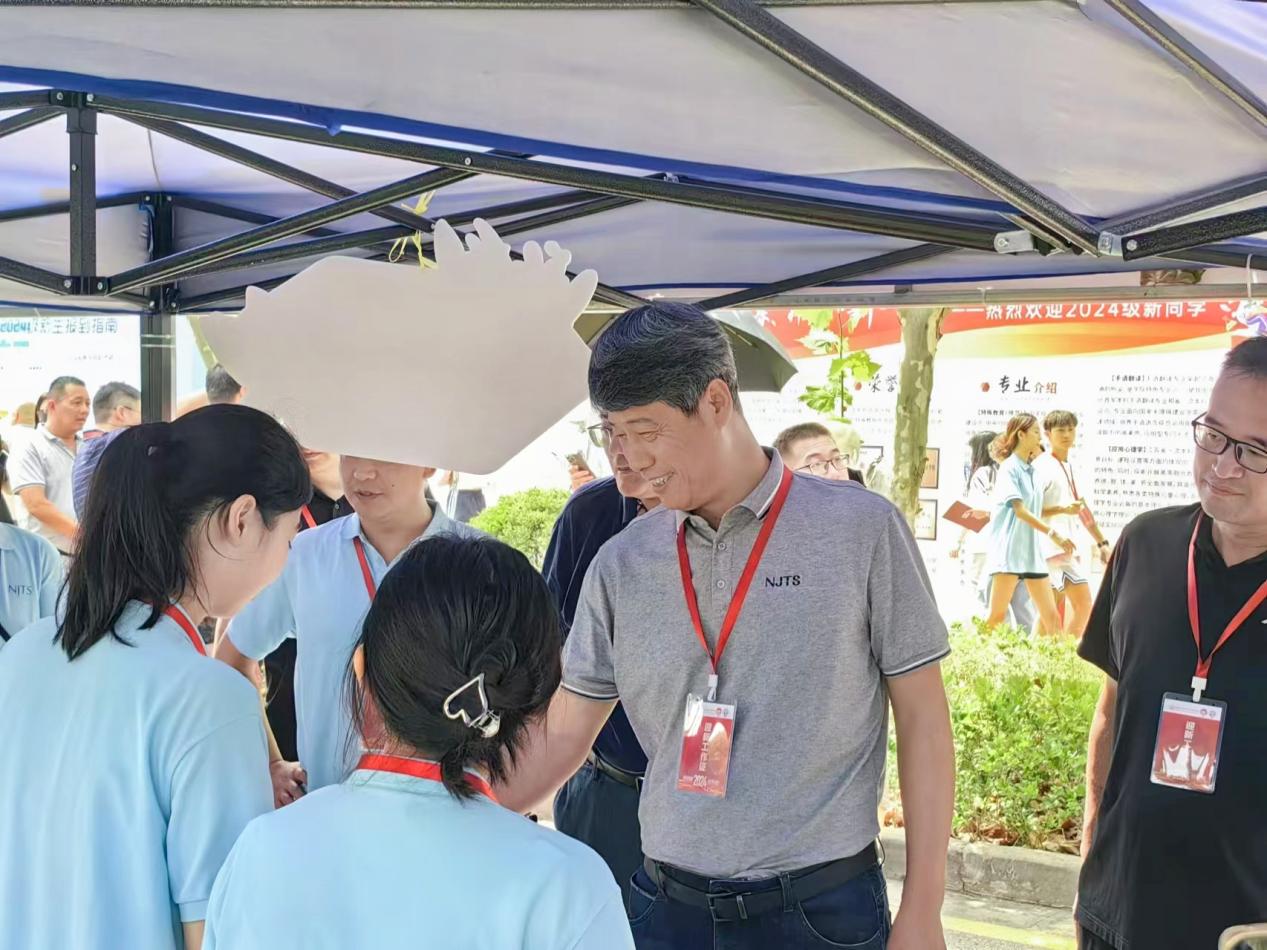 报到当日,校党委黄军伟书记亲临迎新现场指导工作。黄书记在党委书记章小军和李拉院长的陪同下与迎新副班和志愿者们亲切交谈,对学院迎新工作给予高度评价,对学院人才培养工作与新设专业建设寄予厚望,对坚守江宁的新生辅导员给予赞扬和鼓励。黄书记平易近人的笑容,幽默风趣的谈吐,如春风拂面,赢得学院师生们的阵阵掌声。