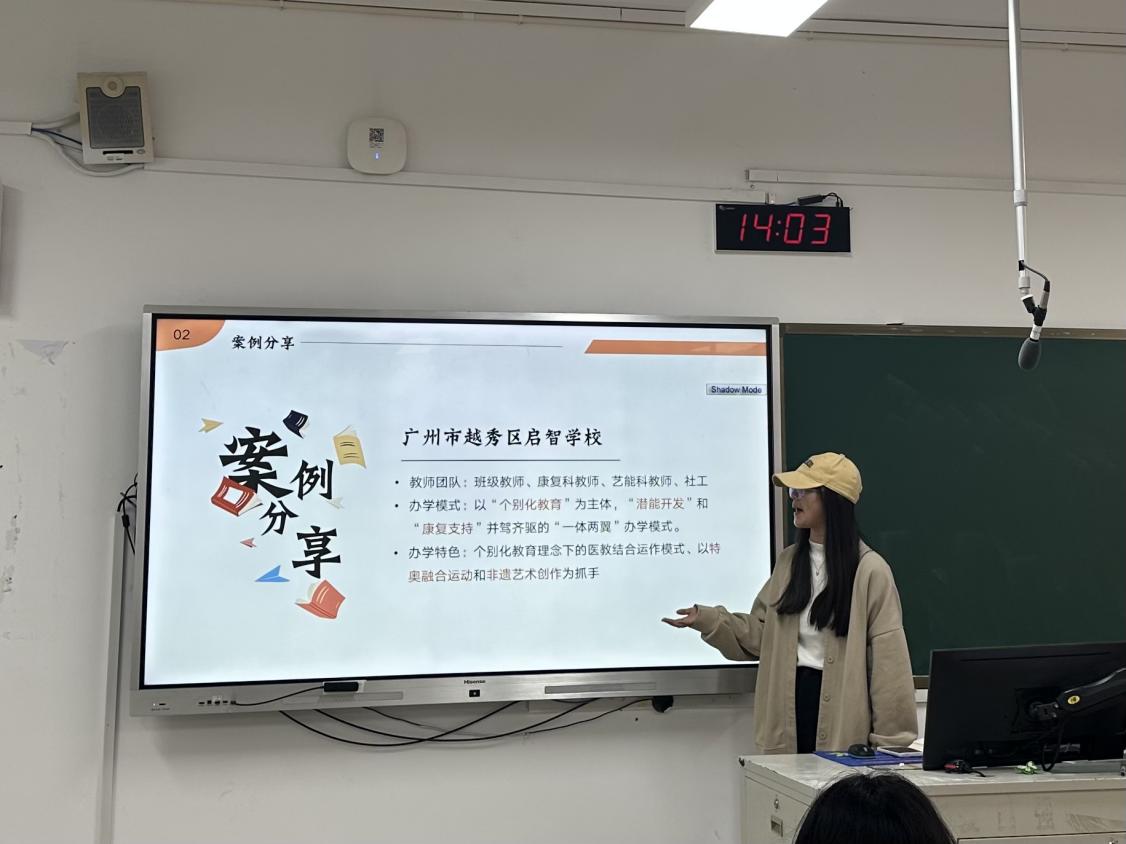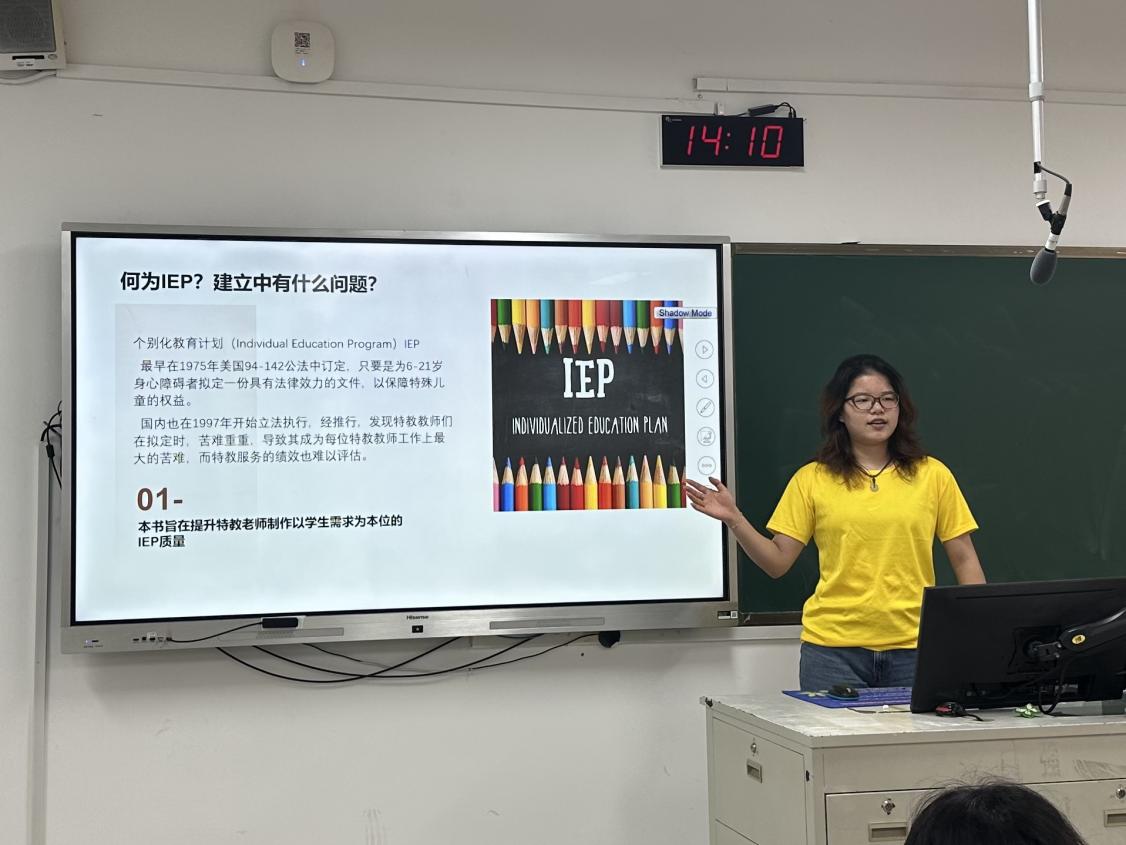会议的第二个板块是有关特殊教育的书籍分享,首先由张蓝心同学分享了她暑期阅读的《特殊教育特色办学路径探索——广东特殊教育的十个办学案例》一书。她着重讲解了广东市越秀启智学校的案例分享,该校以个别化教育理念下的医教结合运作模式、以特奥融合运动和非遗艺术创作为抓手的办学特色。她的分享让同学们意识到应该调整自己的课外实践活动目的,让自己的实践活动以及我们即将迎来的见习活动更加有意义有收获,同时在未来的教学过程中根据所在特殊学校的地域特点、学生特点等各方面特征形成具有地域特色的课程教学体系。