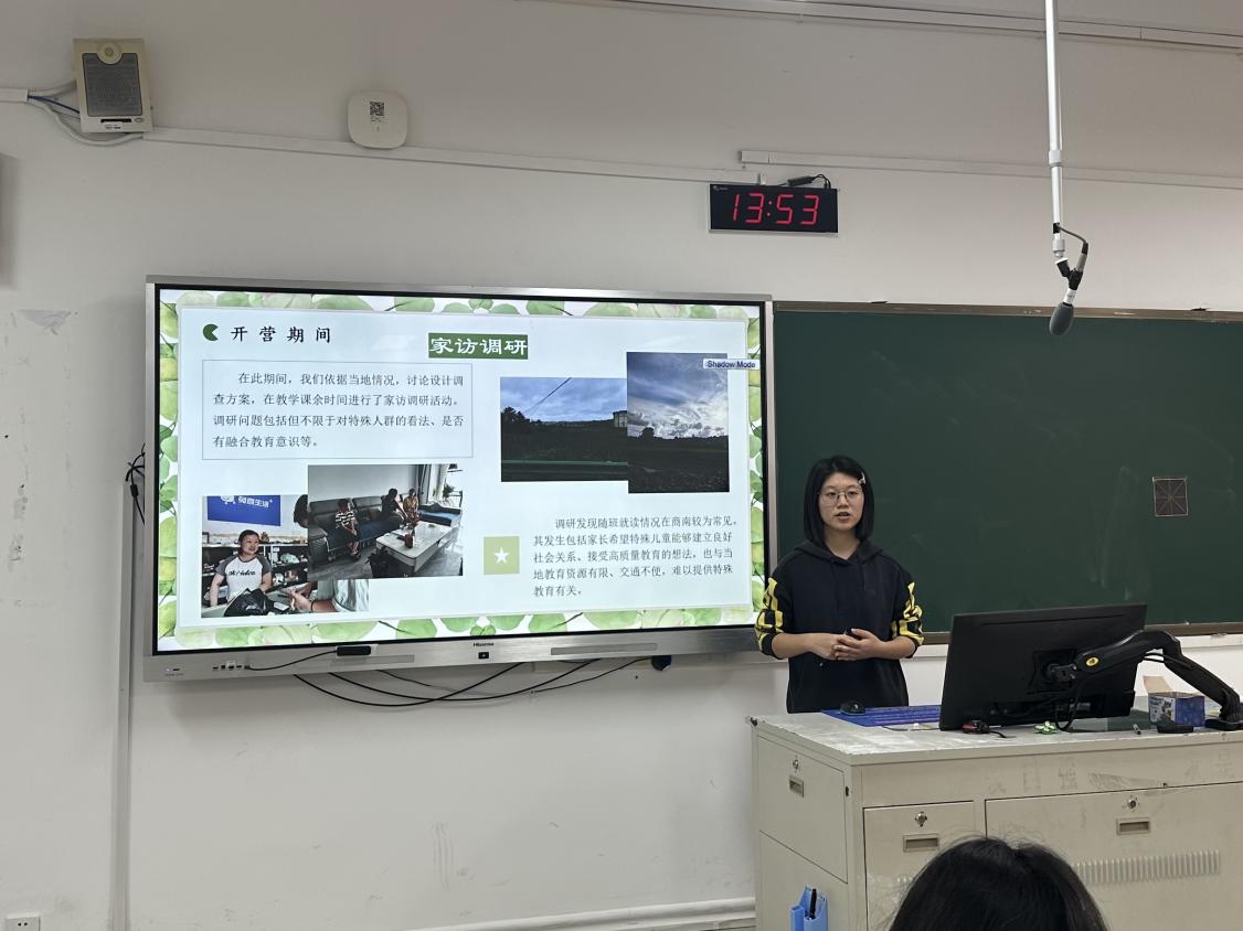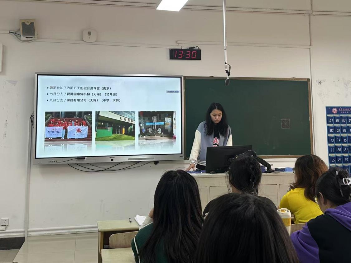会议的第一个板块是暑期实践活动分享,由金玺同学带头分享了她参加融合夏令营、在爱满园康复机构教以及镙磊有限公司帮助特殊学生康复训练的的三次暑期实践经历,展示了实践过程中遇到的困难同时也分享了自己的收获。她搜集了无锡市残儿童康复救助的最新标准,指出当地特殊儿童不同的症状有不同补贴,同时随着年龄增长补助会相应减少;金玺同学还分享了在特殊教育机构学到的一些特殊教学方法,如调动特殊学生的触觉敏感,让他们玩水球、捞小鱼、做面团等。