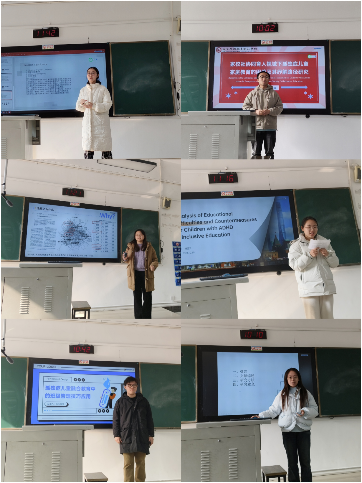 活动现场学术氛围浓厚,任课教师吴江文老师对每位同学的汇报进行了精准点评,帮助学生进一步优化研究思路和方法。陈琳副院长在活动总结中对学生的表现给予高度评价。她表示:“本次活动展示了同学们扎实的理论功底与创新思维,也体现了他们对特殊教育事业的热情与担当。希望大家在今后的学习和研究中,进一步深化问题意识,注重实践探索,为推动特殊教育的发展贡献更多力量。”