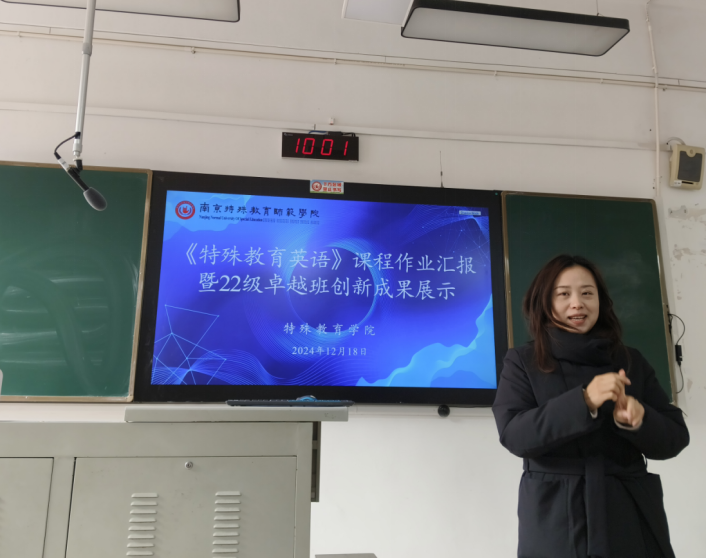 2024年12月18日,《特殊教育英语》课程作业汇报暨22级卓越班创新成果展示活动在博雅楼2505成功举办。本次活动中,卓越教师班的30名同学围绕自己所关心的特殊教育领域研究问题进行了精彩的开题报告展示,从多角度、多层次探讨特殊教育中的热点与难点问题,为特殊教育事业的发展注入新的活力。吴江文老师对部分同学的研究给出了更具体的修改建议。陈琳副院长莅临现场指导并对同学们的研究方向给予了高度肯定和专业建议。