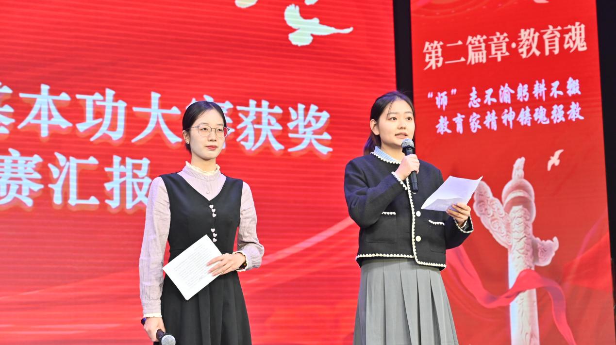 墨香书就教育华章;雅言铺就育才之路。省师范生基本功大赛获奖选手周烨琦、邵韵涵与同学们分享了比赛的心路历程和参赛经验,她们娓娓道来的精彩汇报是对学院人才培养和立德树人成果的强有力说明,她们获得的成绩更是一种朋辈激励和榜样力量,激励着更多的同学们在未来争取更大进步。