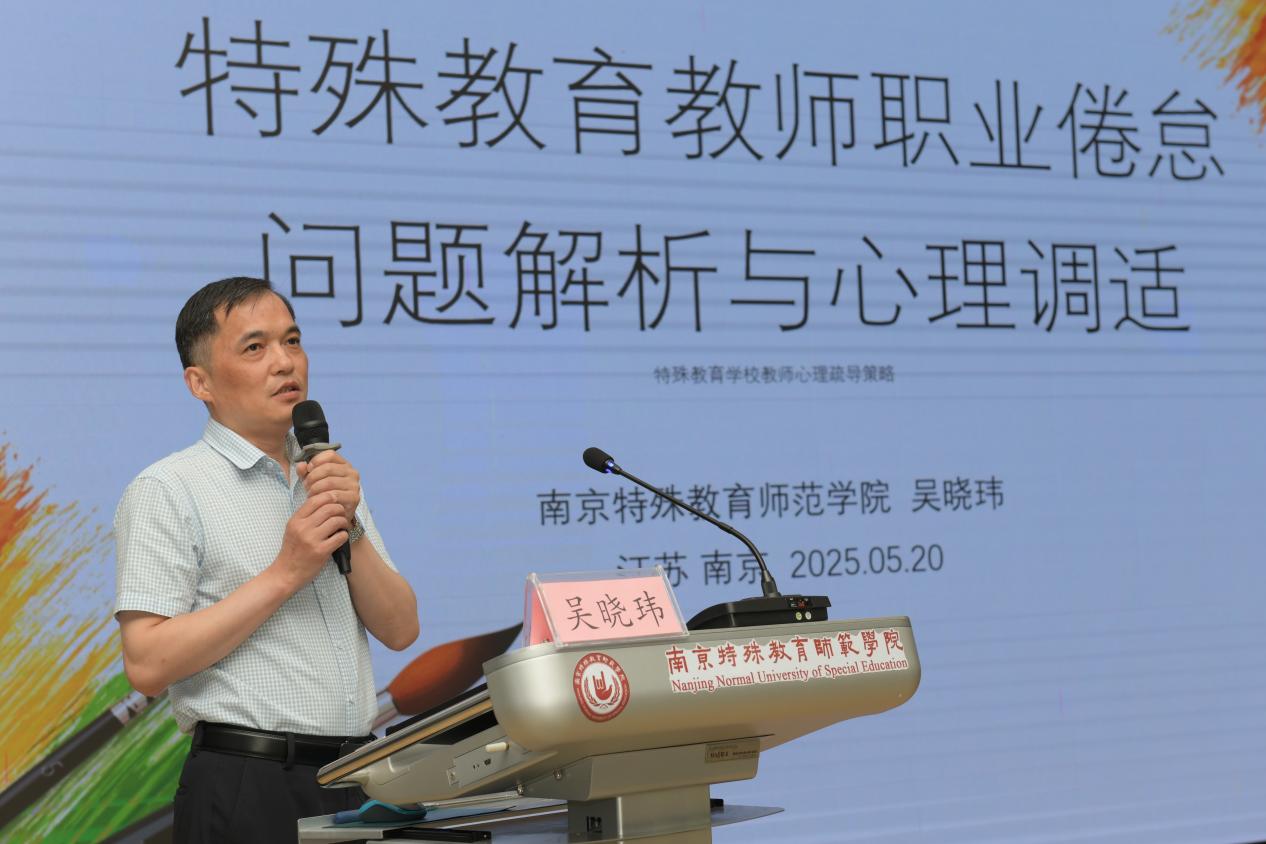 吴晓玮教授以“特殊教育学校教师心理疏导策略”为题,强调要关注特殊教育学校教师的心理健康,并且提供了有效的心理疏导策略,帮助一线教师应对工作压力,保持良好的心理状态。