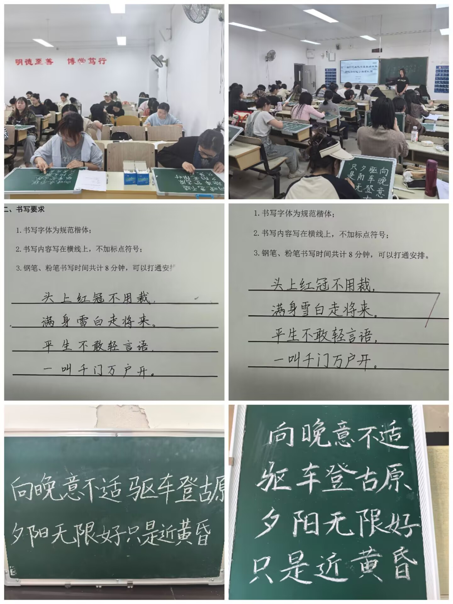 钢笔字与粉笔字书写比赛作为师范生基本功的重要体现,2022级、2023级、2024级选手们挥毫泼墨,书写工整规范,每一笔每一划都透露出对师范生基本功的执着追求。钢笔字书写中,选手们笔力遒劲,字迹端庄秀丽;粉笔字书写中,选手们布局合理,板书清晰流畅,赢得了评委们的细致评审与高度评价。