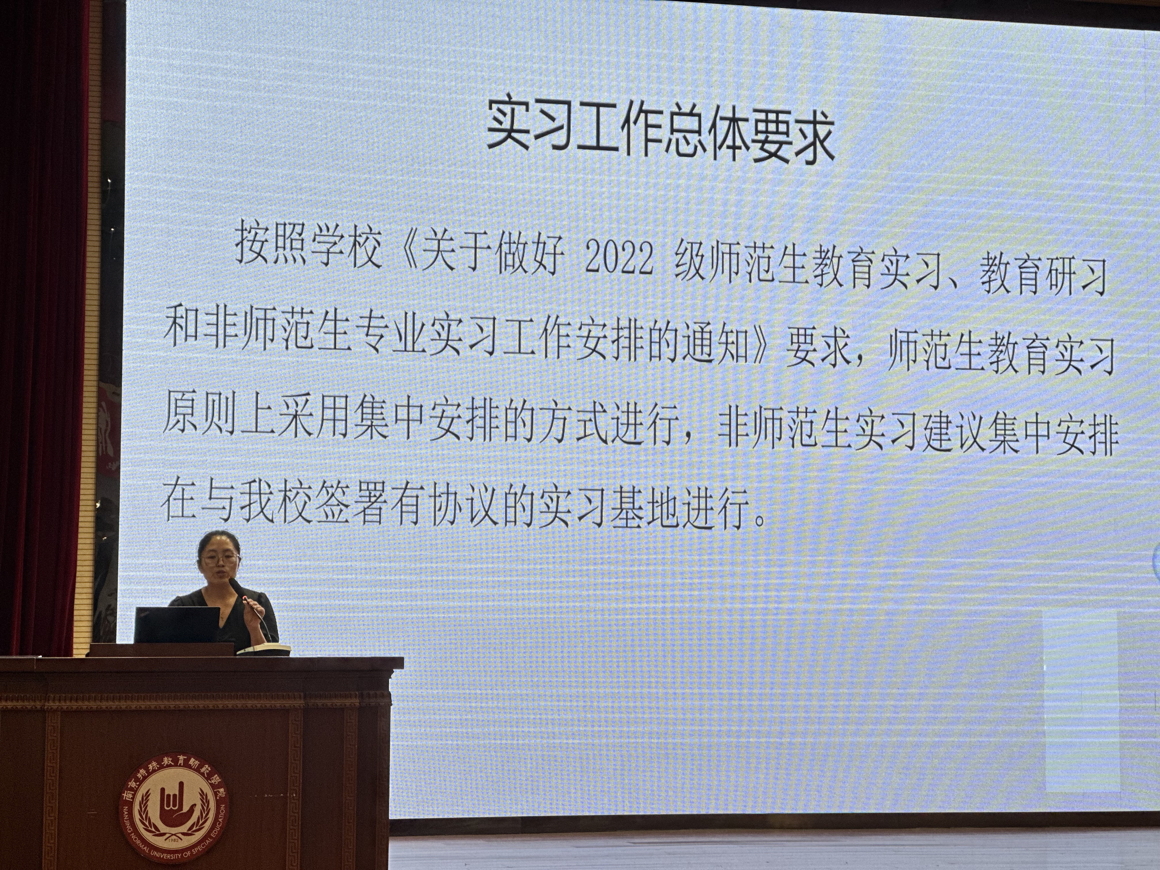 何燕春副院长详细解读了实习工作的总体要求和日程安排。她指出,实习工作原则上采取集中实习形式,分为实习报道、学习、教学、汇报、研习和总结等多个阶段。她提醒同学们要认真填写实习手册和研习手册,及时上传课堂教学视频和实习简报,并强调了自主实习的注意事项。