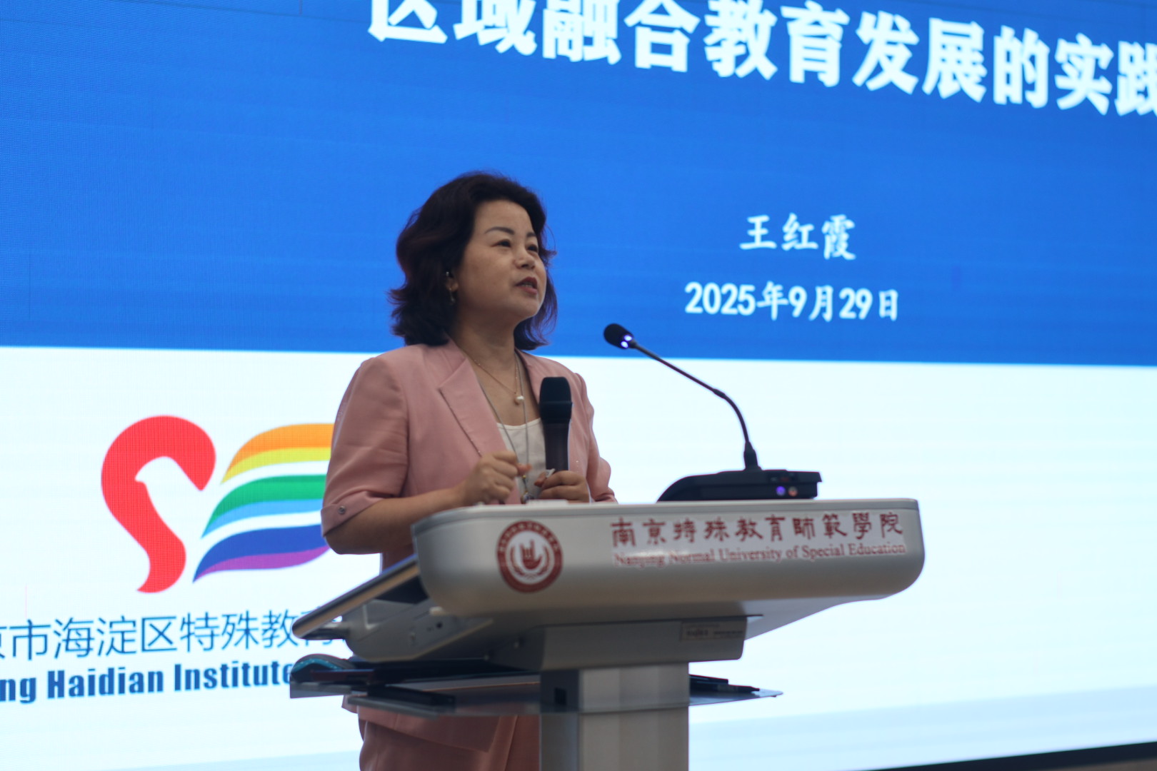 王红霞校长以“推进普惠全覆盖 构建发展共同体”为题,聚焦融合教育的区域实践,系统介绍了海淀区融合教育的发展路径与实践经验。她从专业师资能力建设与优质教育资源供给两个维度出发,深入剖析了学校在融合教育背景下提升专业服务质量的策略与方法。王校长的报告兼具前瞻性与实操性,有效激发了师生对理论知识如何转化为实践动力的深入思考。