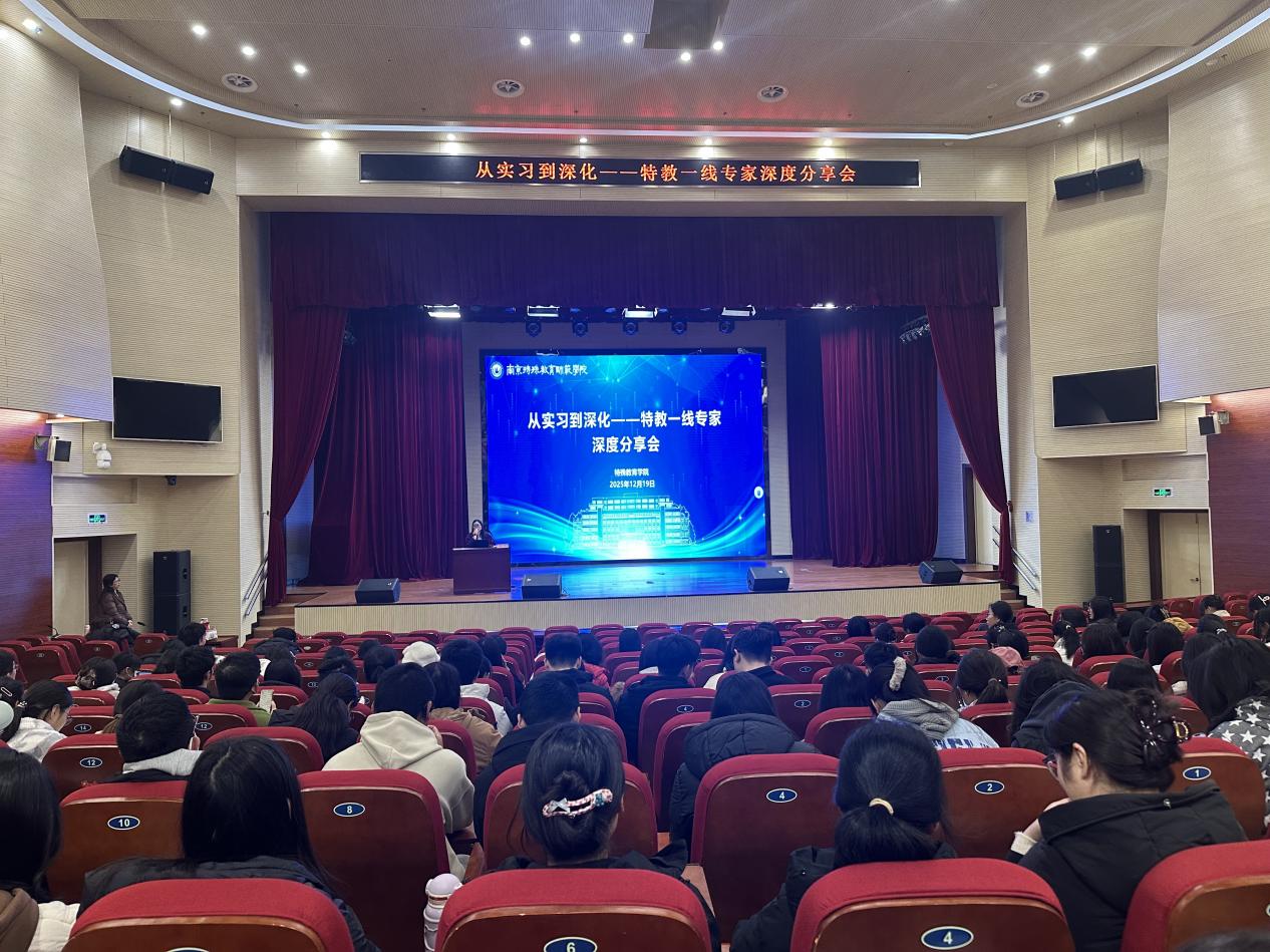2025年12月19日,一场题为“从实习起步到专业深化——特教一线专家深度分享会”的专题讲座成功举办。活动聚焦特殊教育领域的教学设计和班级管理,深入探讨其核心方法与实施艺术,特邀南京市六合区特殊教育学校副校长梅红与栖霞区特殊教育学校副校长周蕾担任主讲。两位专家结合自身丰富的教学实践案例与班主任管理经验,为2022级学生带来了一场内容扎实、富有启发的专业分享。