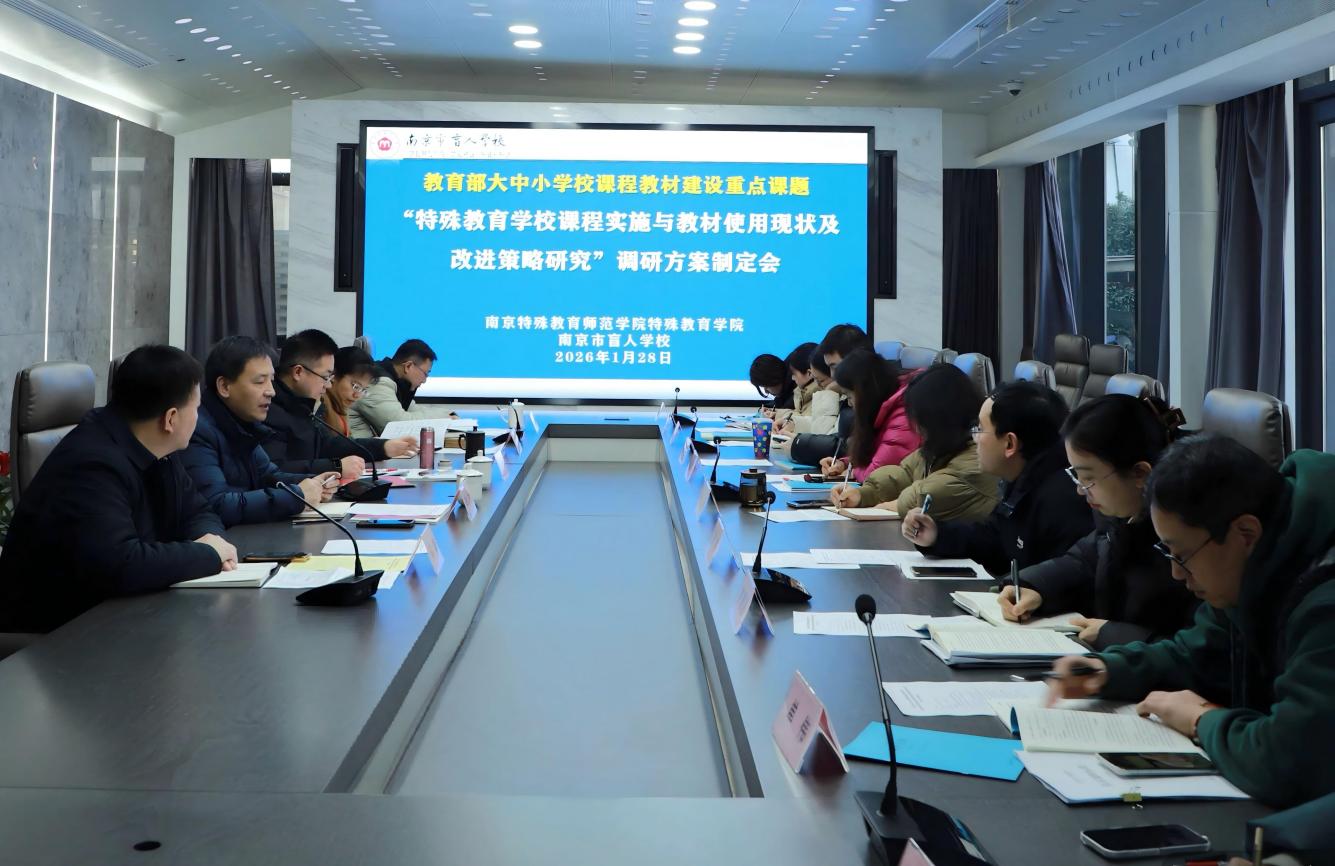 2026年1月28日,永利yl23411集团在南京市盲人学校召开教育部大中小学课程教材研究重点项目“特殊教育学校课程实施与教材使用现状及改进策略研究”调研方案研讨会。项目负责人、永利yl23411集团院长李拉教授,永利yl23411集团视障教育研究中心主任琚四化教授,南京市盲人学校党总支书记郑斌、校长任涛、副校长华建英、副校长王吉星和十二名骨干学科教师参加了此次研讨会。