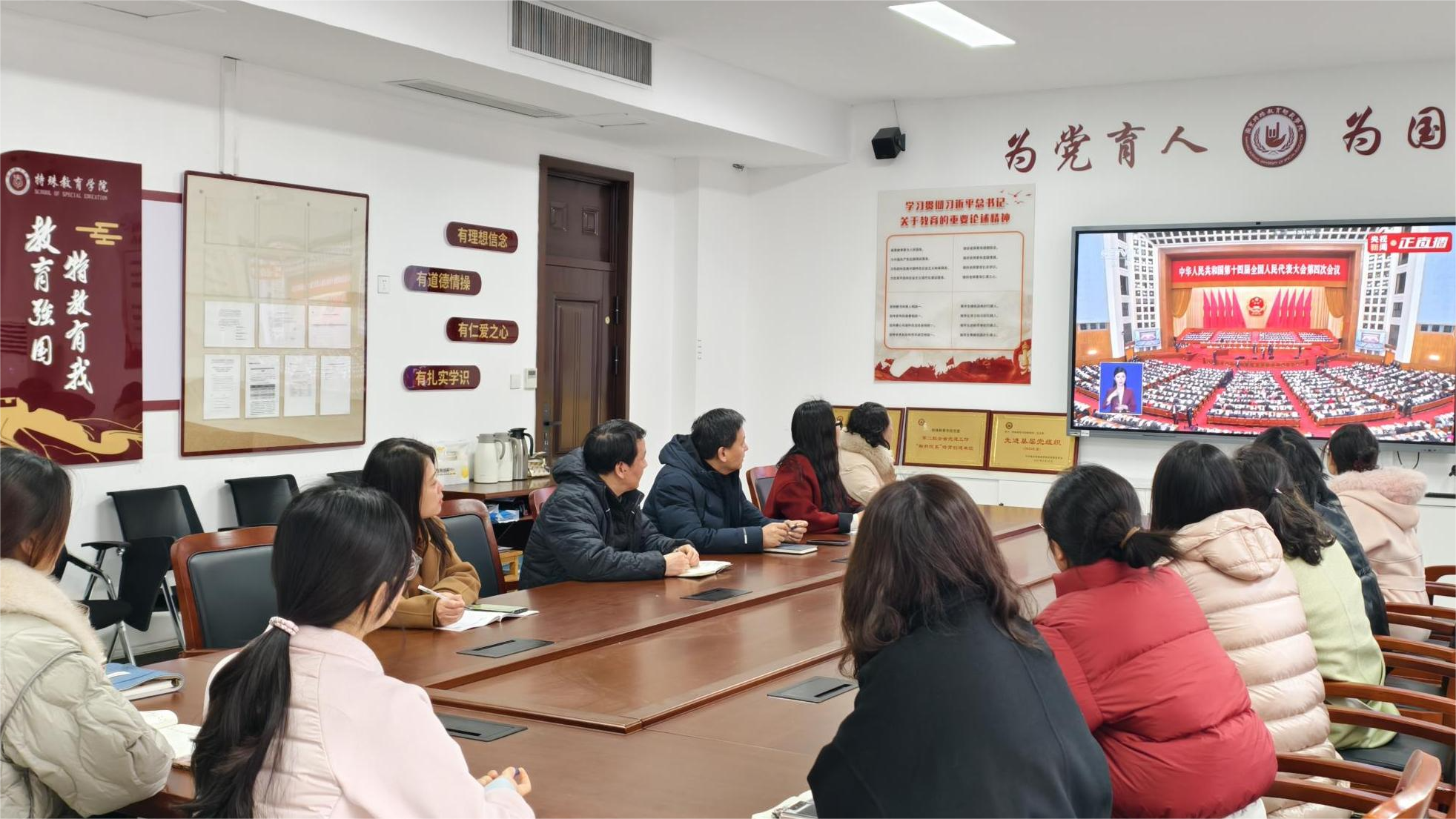 上午9时,会议正式开幕。全体同志认真聆听国务院总理李强所作的《政府工作报告》,不时记录报告中的重要论述和关键数据。当报告提到要“深入实施科教兴国战略,强化高质量发展的基础支撑”,要“坚持教育强国、科技强国、人才强国建设一体统筹推进”以及“办好特殊教育、继续教育,引导规范民办教育发展”时,引发了在场人员的强烈共鸣和深入思考。《政府工作报告》结束后,现场进行了热烈的交流研讨。
